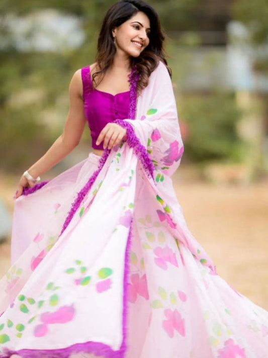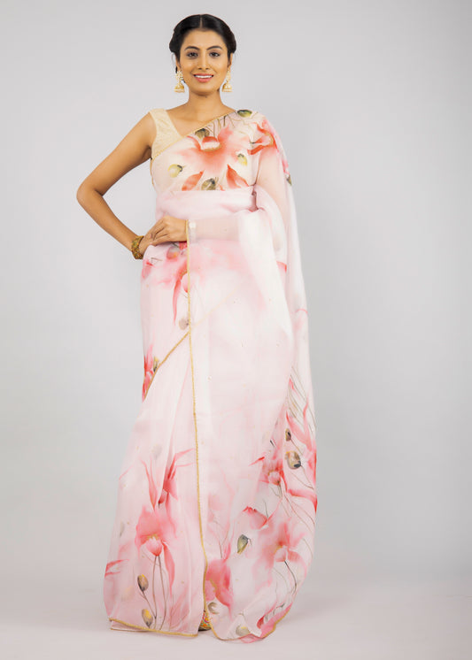 Hand-Painted Peachy Pink Floral Chiffon Saree
