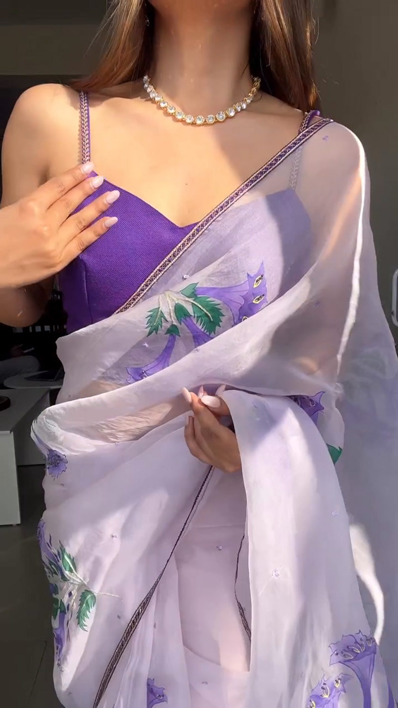 Hand-Painted Pastel Mauve Whimsical Butterfly Silk Organza Saree