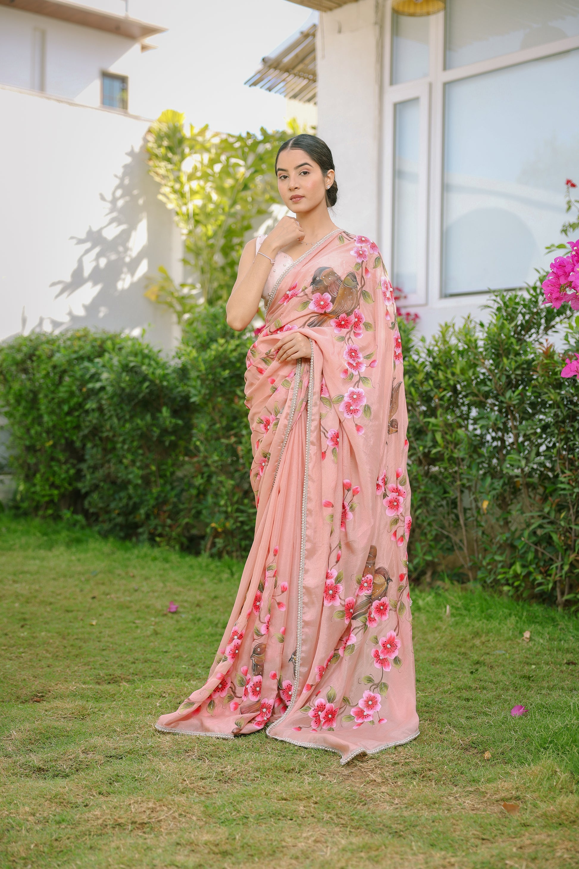 Hand-painted floral saree enhanced with hand embroidered glass beads work and a rich glass beads border.