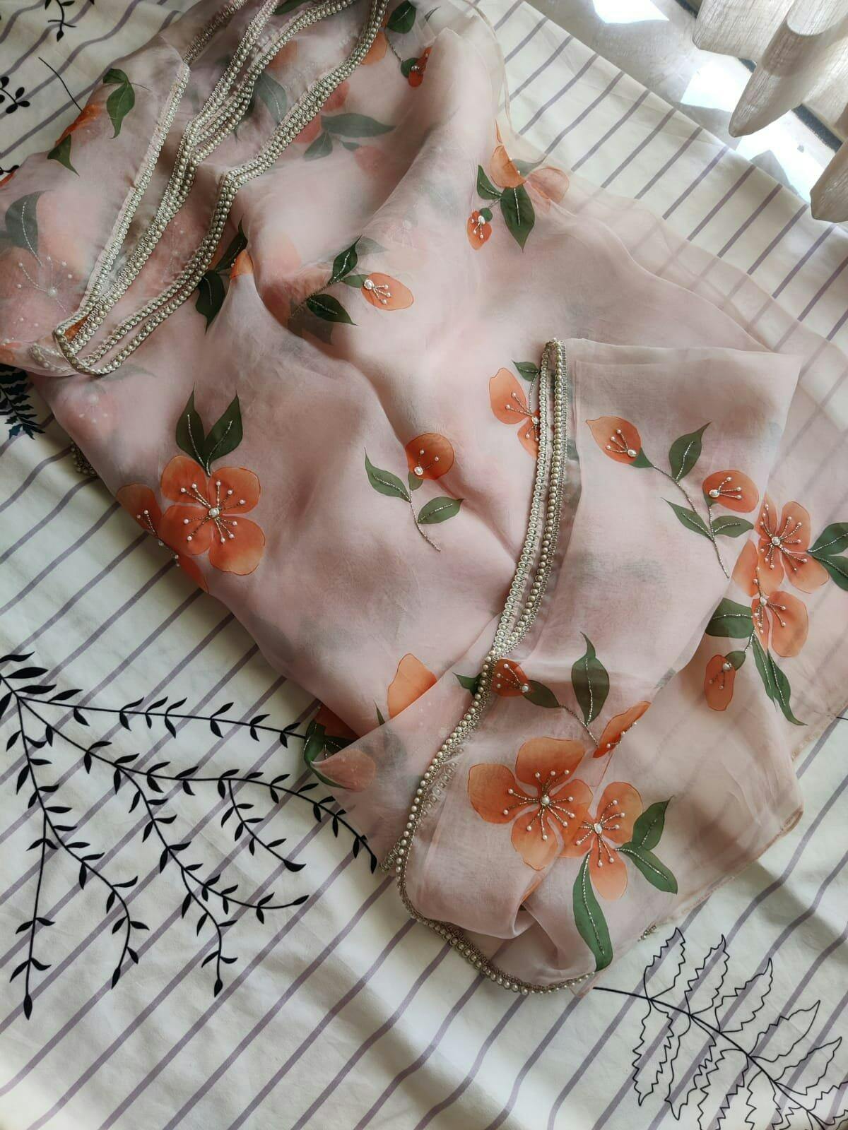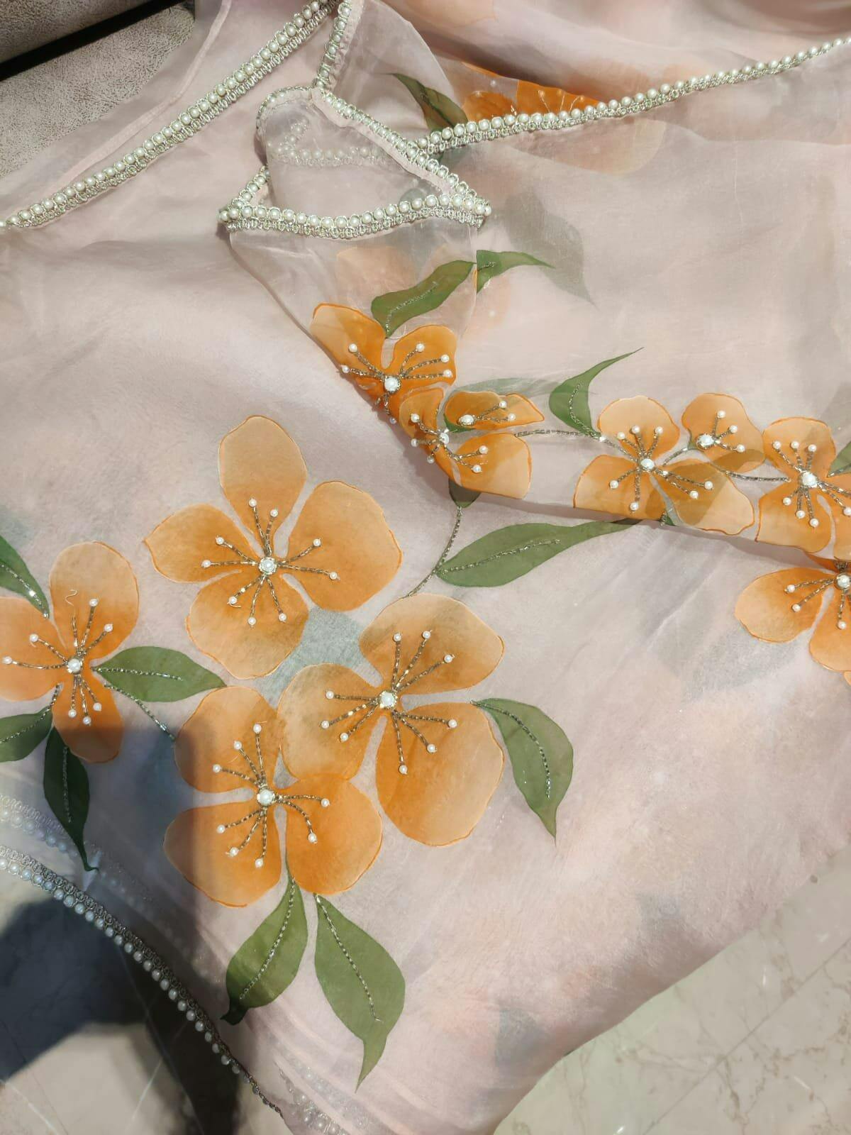 Pastel peach silk organza Saree, embellished with hand-painted florals and enhanced with handembroidered pearls and glass beads Finished with a pretty pearl border. Saree comes with an unstitched silk base blouse piece and fall finishing.
