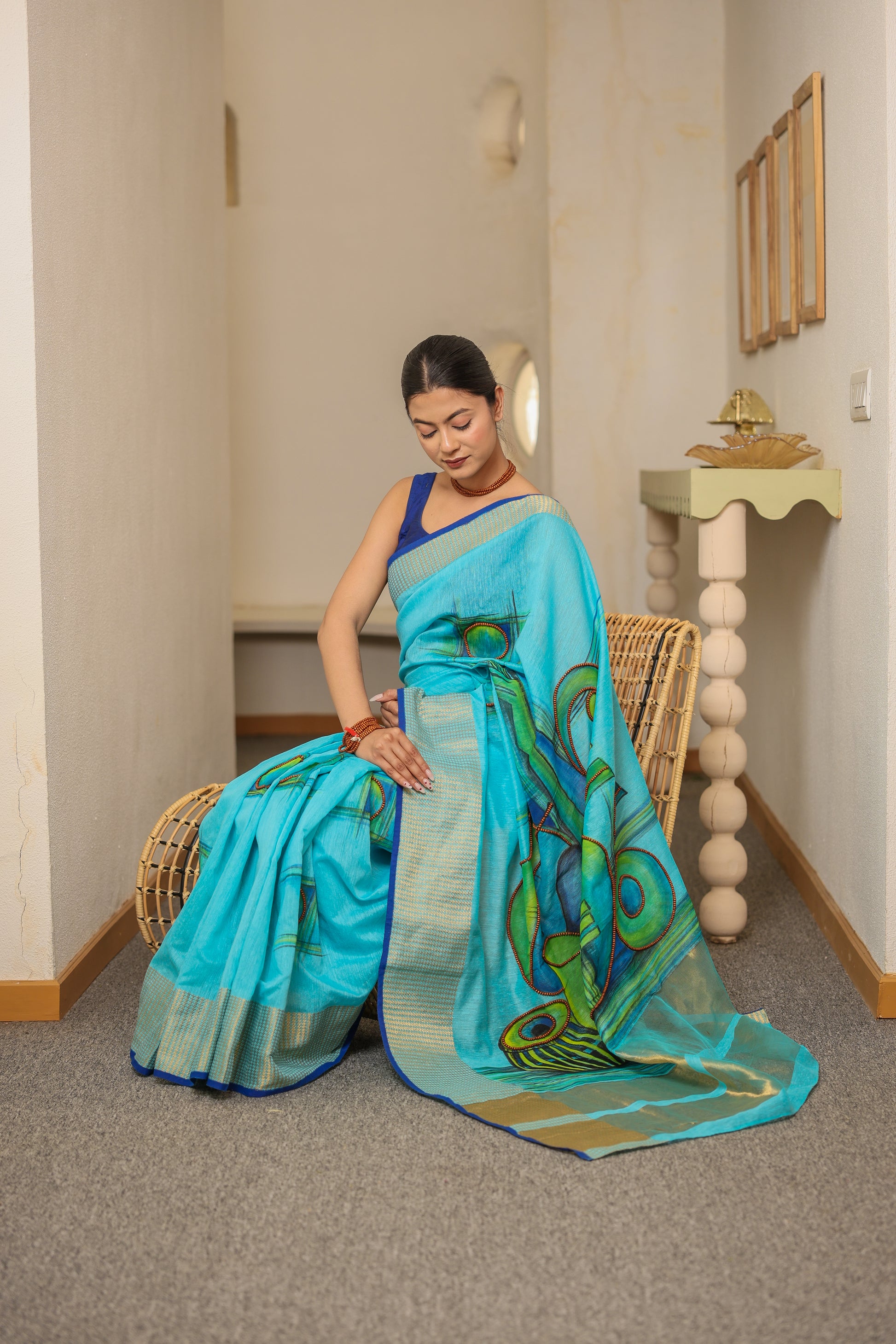 Hand-painted and enhanced with hand embroidered wooden beads work. Saree comes with a silk blouse piece and finished with fall