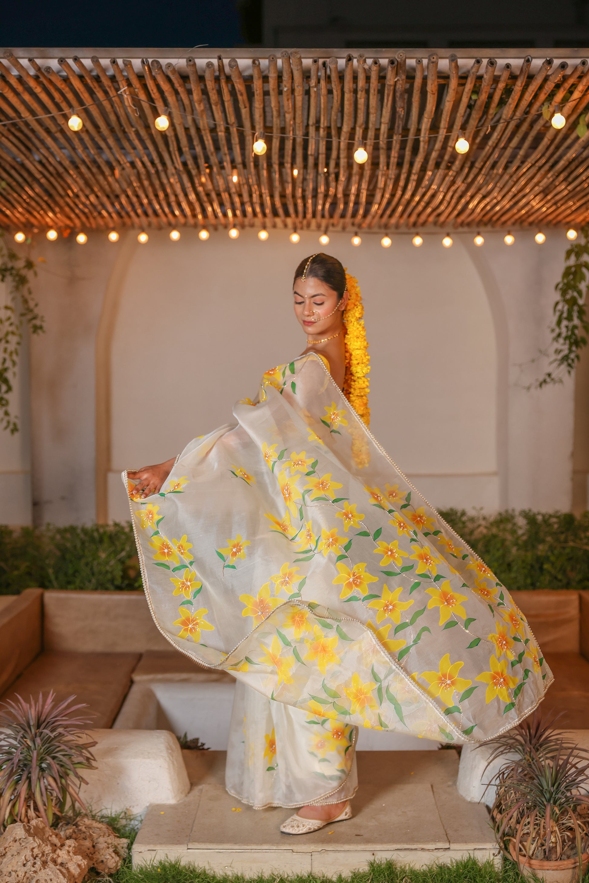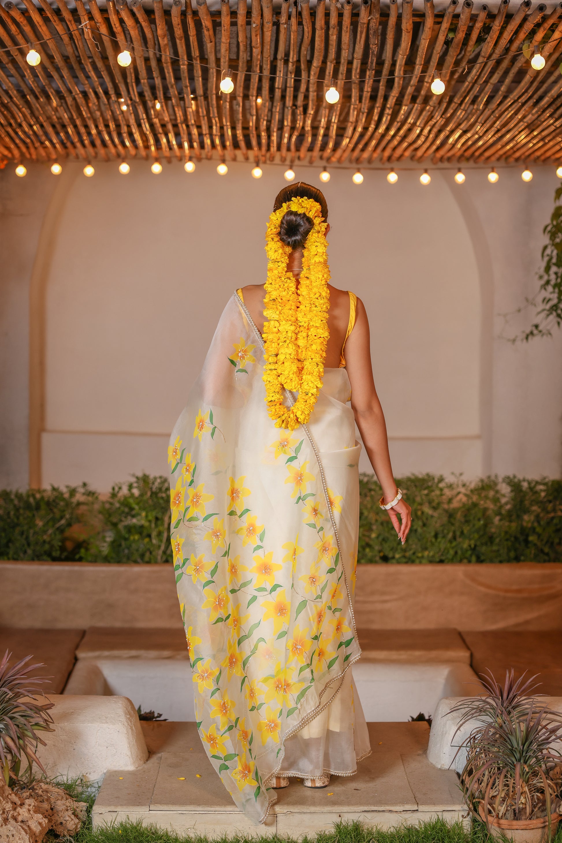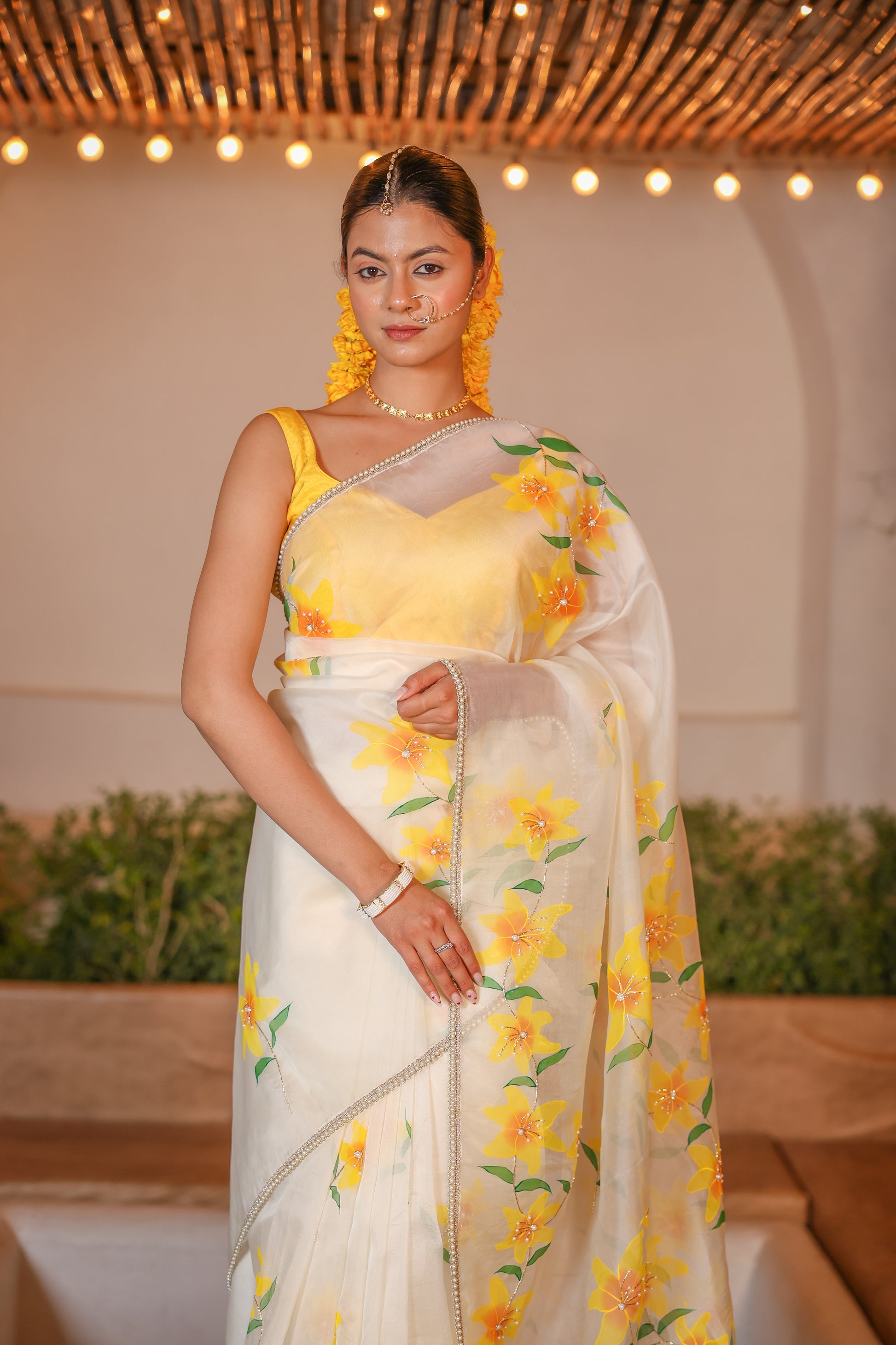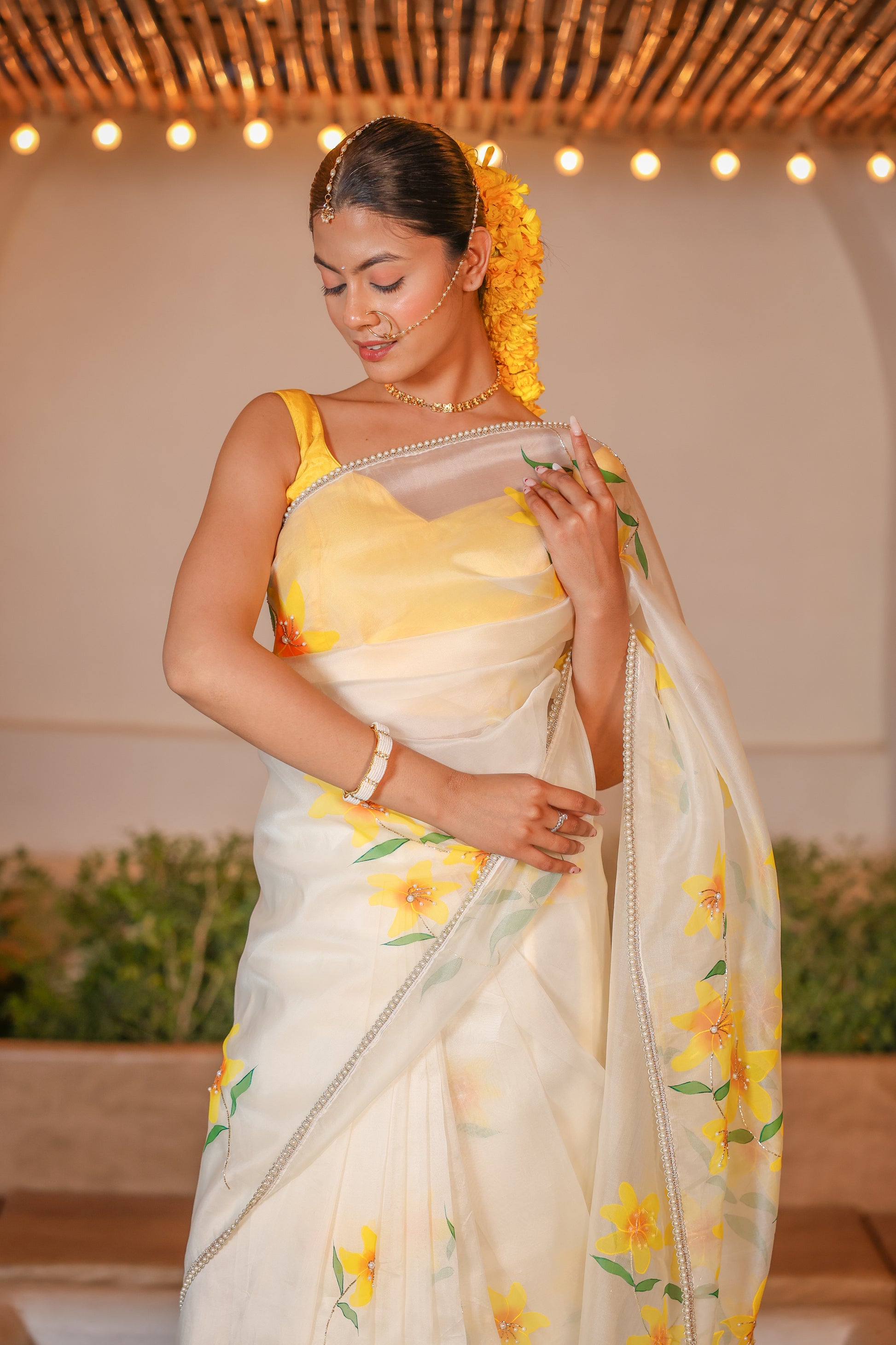 Ivory Silk Organza Saree enhanced with hand-painted florals and hand-embroidered pearls and glass beads detailing.