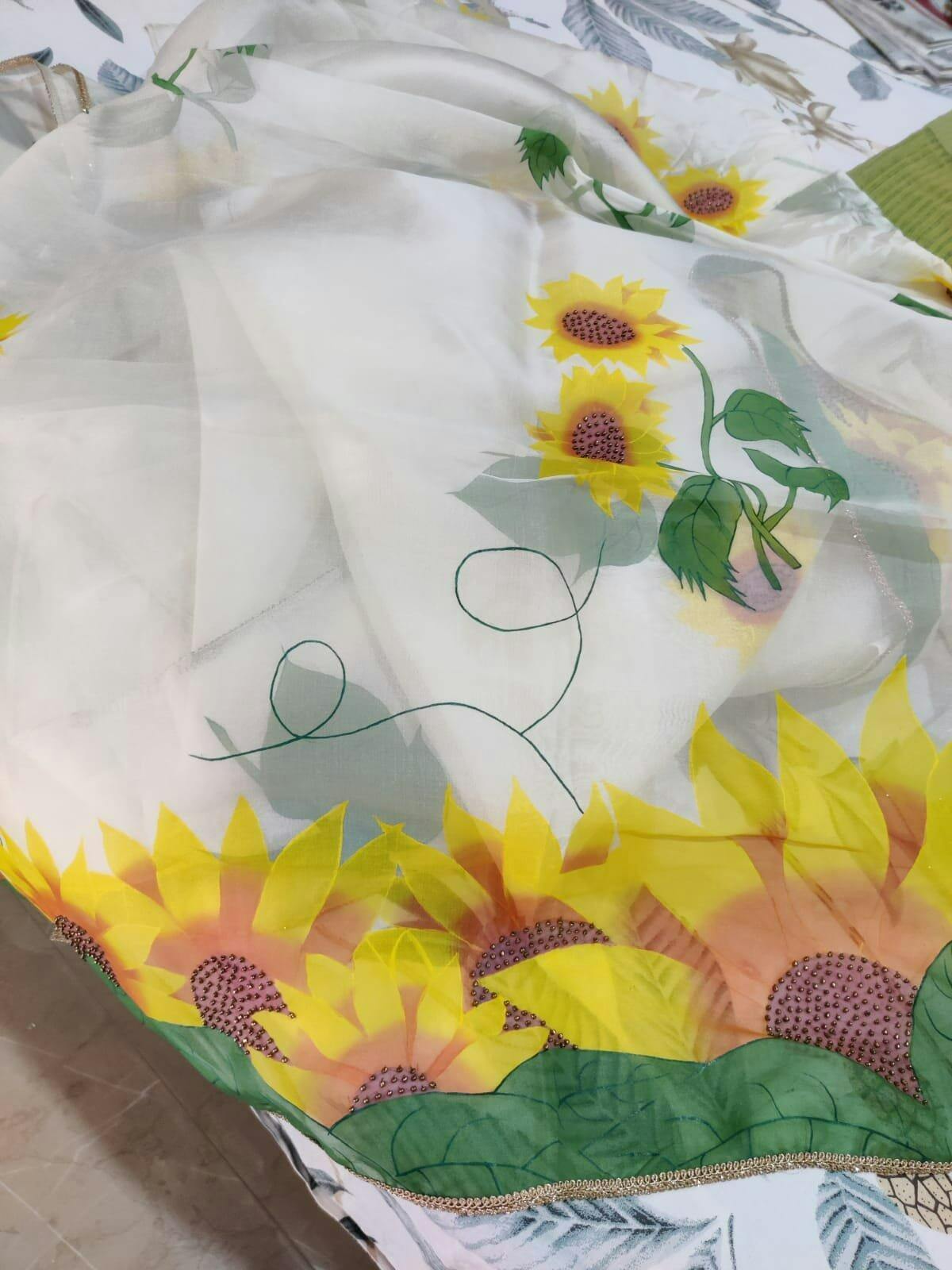 Hand-Painted Ivory Sunflower Silk Organza Saree