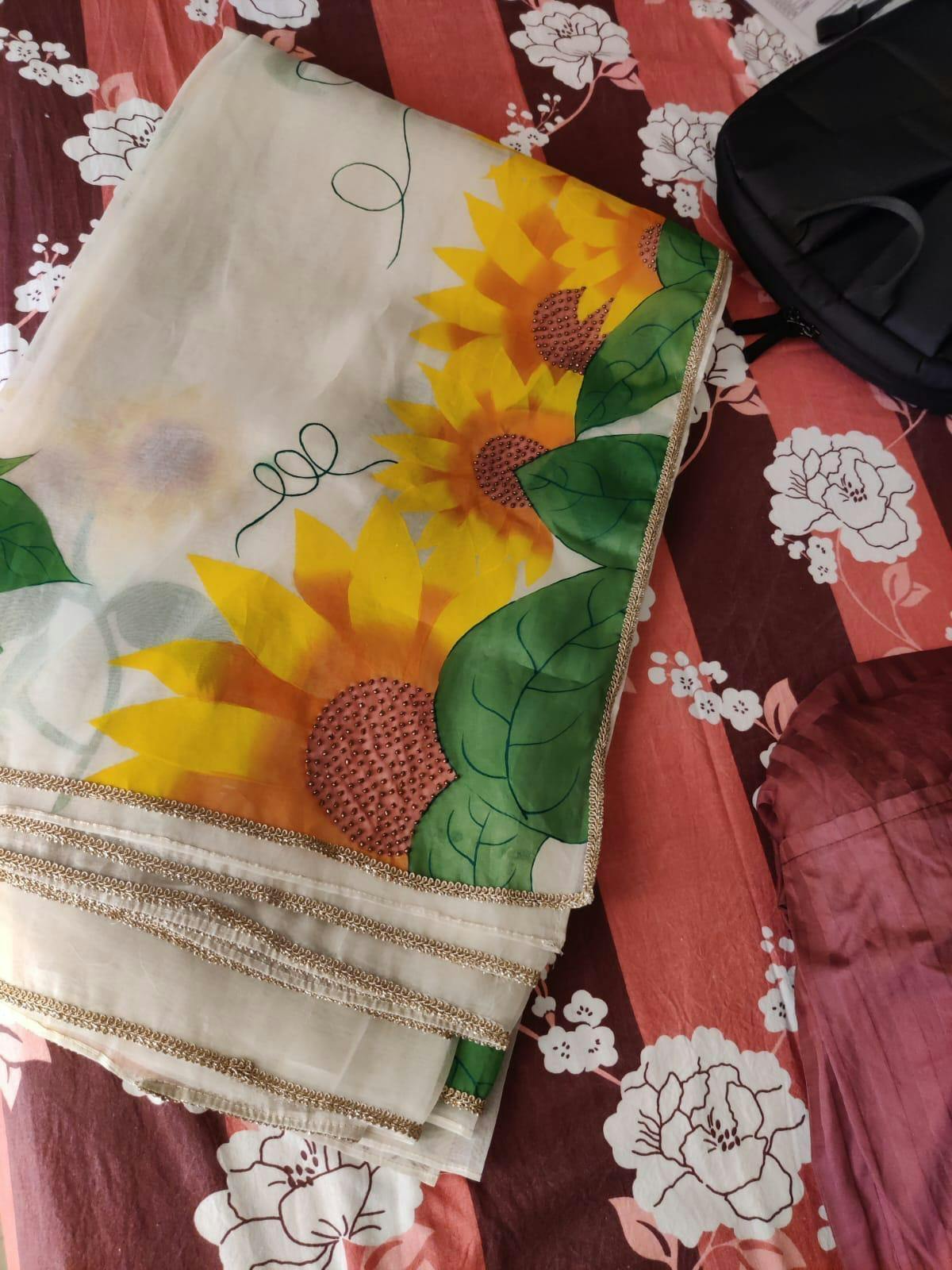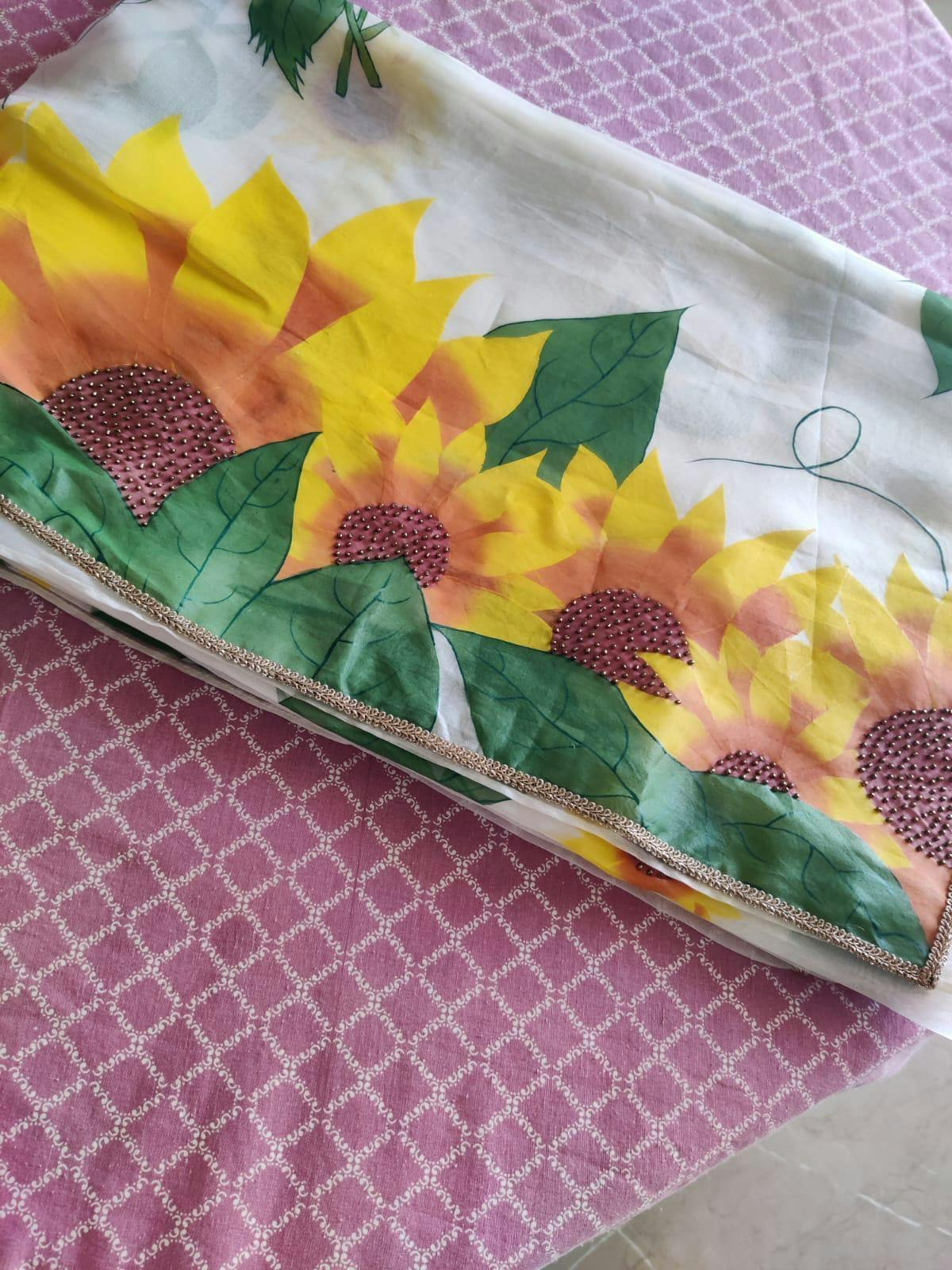 Ivory pure silk organza saree, embellished with hand-painted sunflowers. The saree is well finished with a pretty sleek border. Saree comes with an unstitched silk base blouse piece and fall finishing.