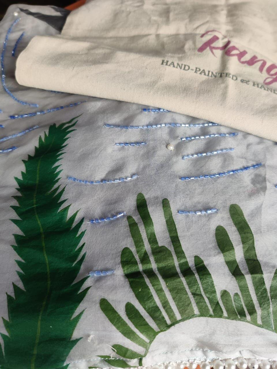 Craft | Handpainted and Hand-Embroidered Pearl and Glass Beads Detailing. Highlighted with a pearl border. |