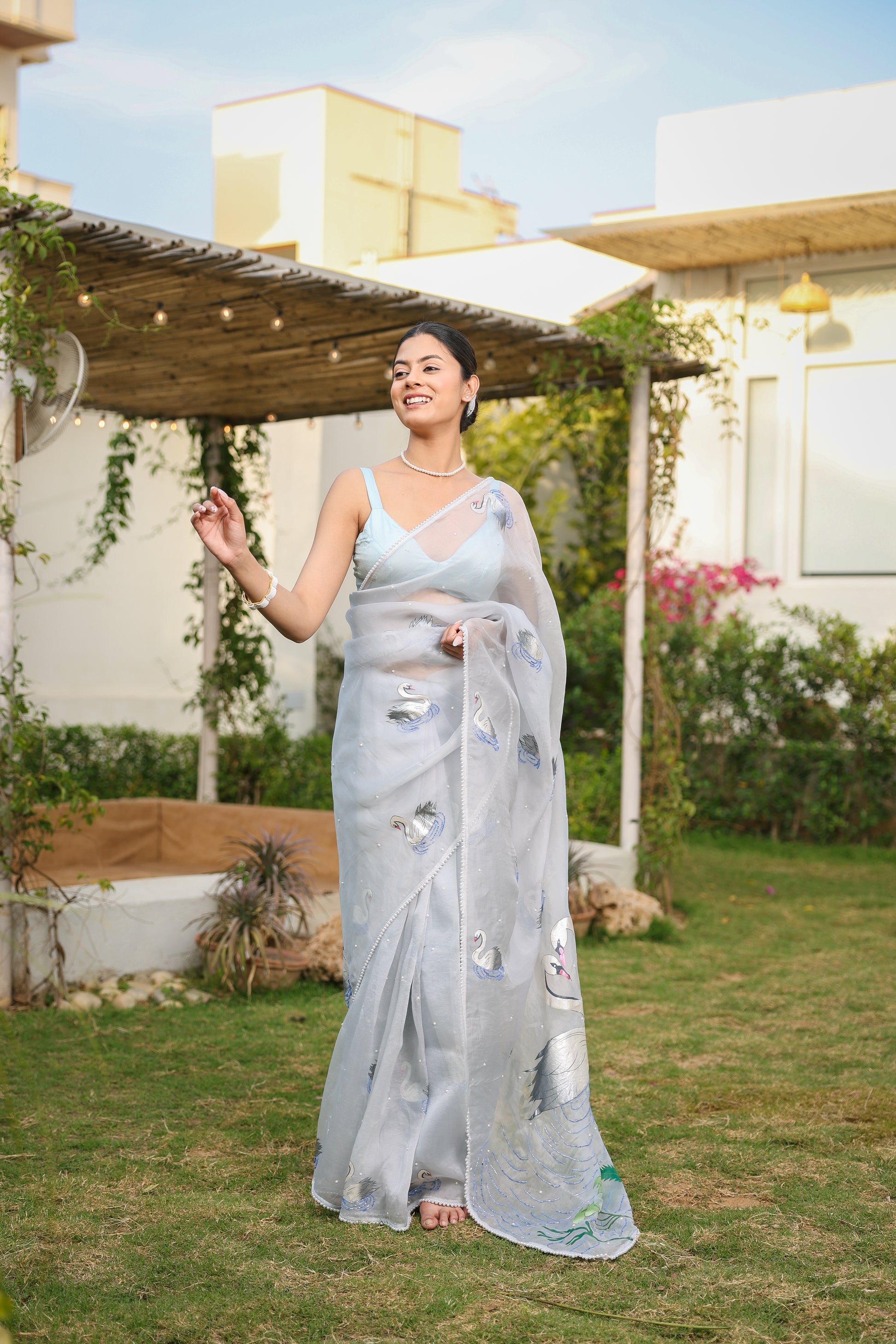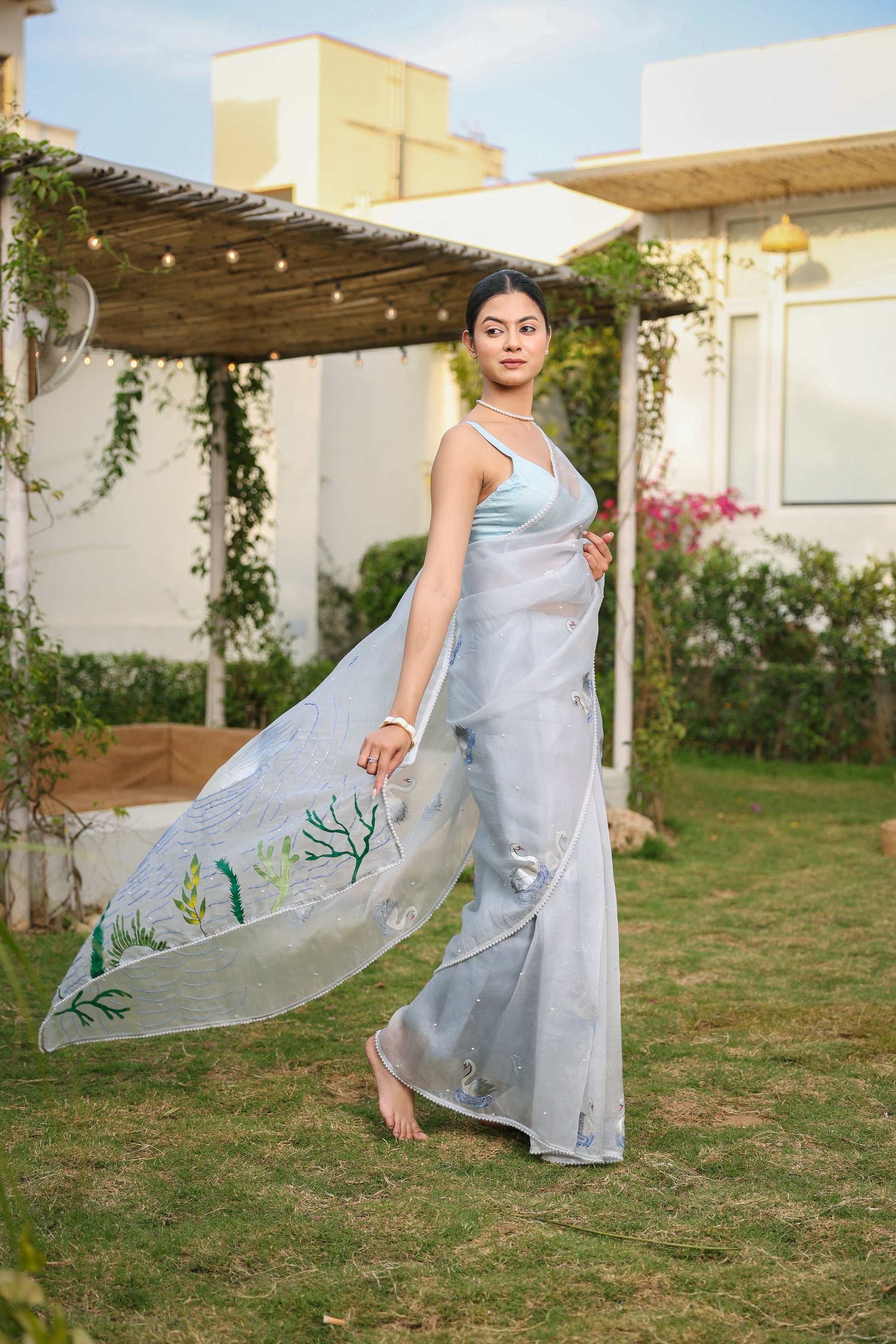 Pastel blue silk organza saree, embellished with hand-painted swans. The saree is well finished with a pearl border. Saree comes with an unstitched silk base blouse piece and fall finishing.