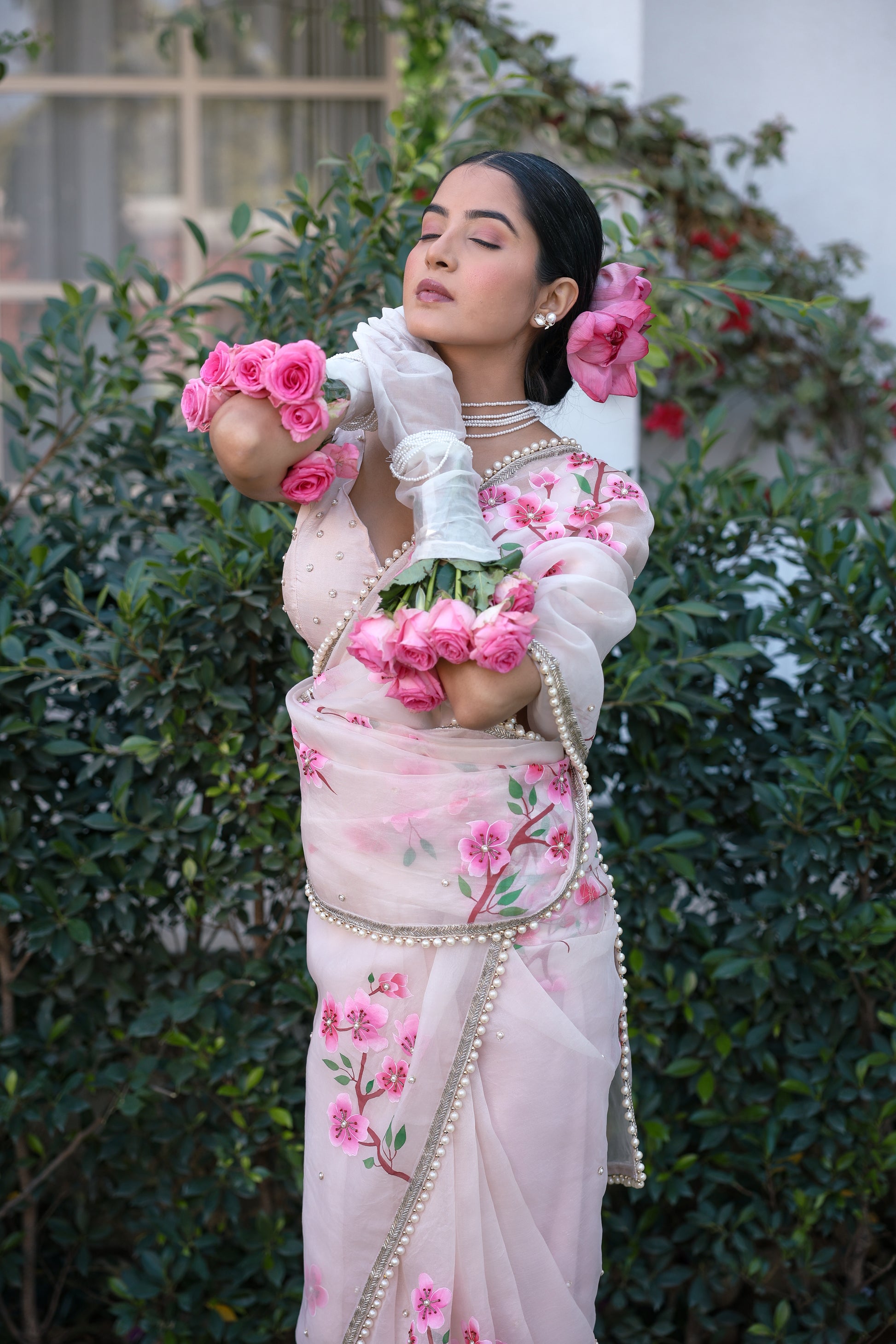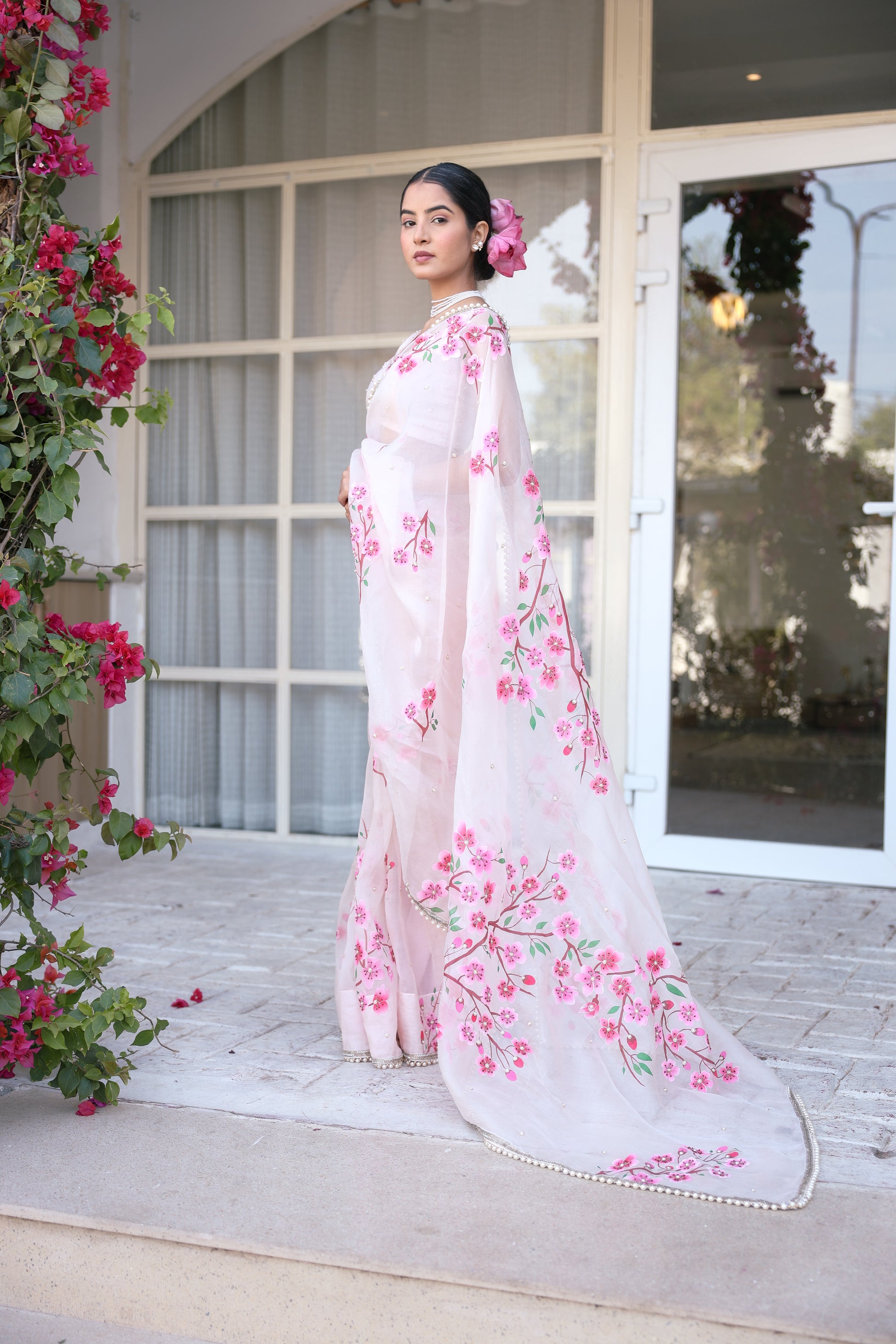 Hand-Painted Powder Pink Silk Organza Saree, enhanced with hand-painted florals and hand-embroidered pearl and glass beads detailing. Highlighted with a glass beads and pearl border. Saree comes with a silk base blouse piece and finished with fall.